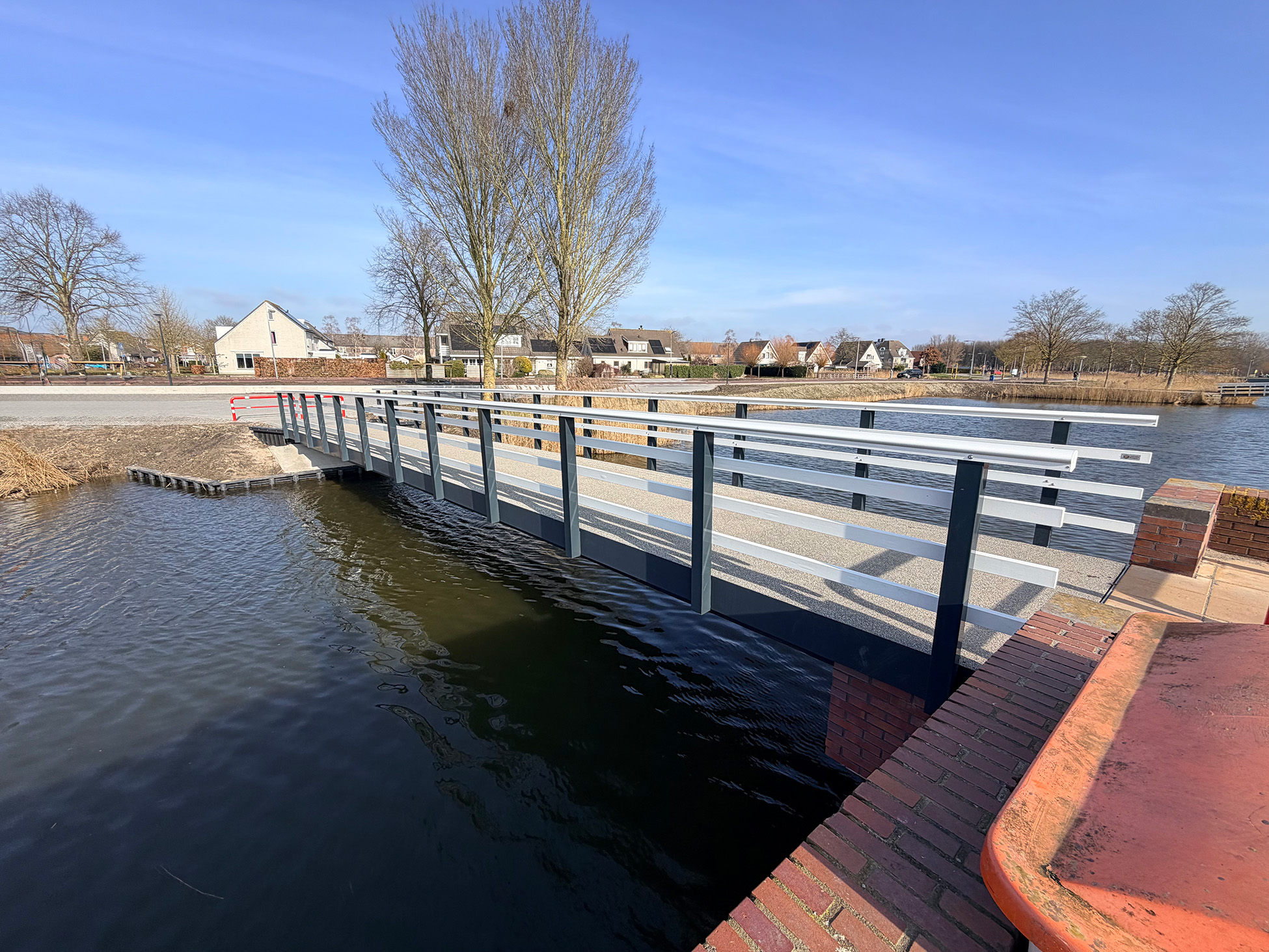 Op locatie is de bestaande kade aangepast, zijn funderingspalen geheid en zijn de landhoofden gemaakt. De prefab composieten brug is geleverd door Fibercore en is in één ochtend op zijn plek gehesen.