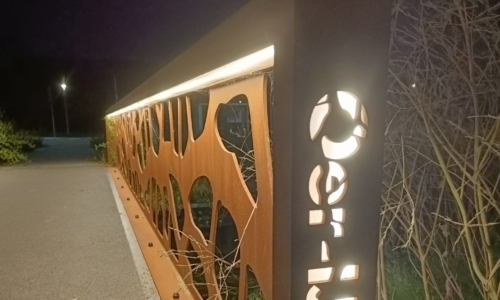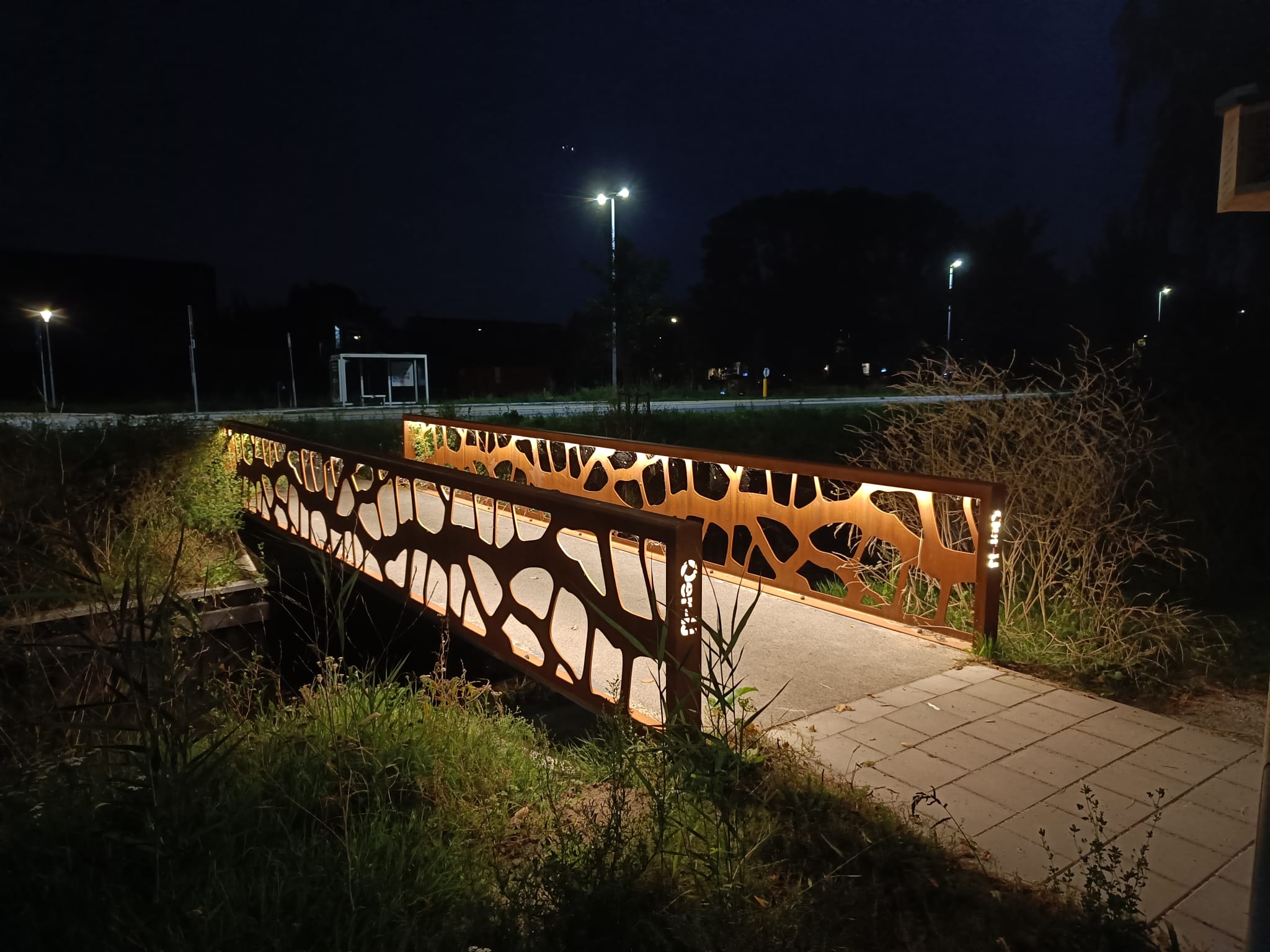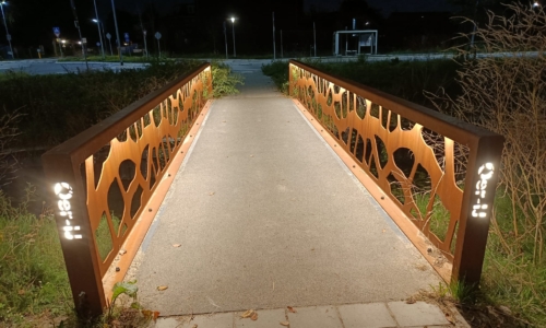 Anton Constructiewerken heeft het leuningwerk samengesteld uit cortenstaal en in de werkplaats van Anton Bruggen is deze voorzien van verlichting en afdekplaten.