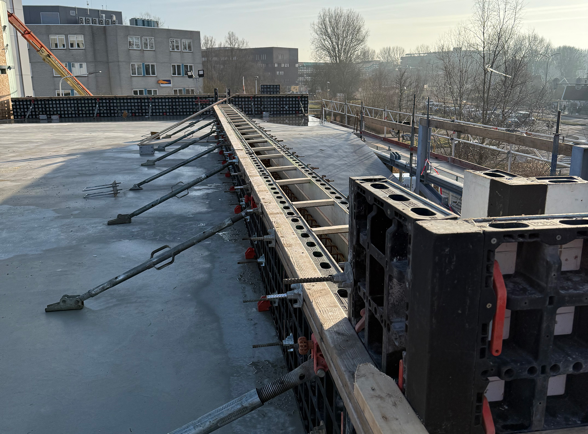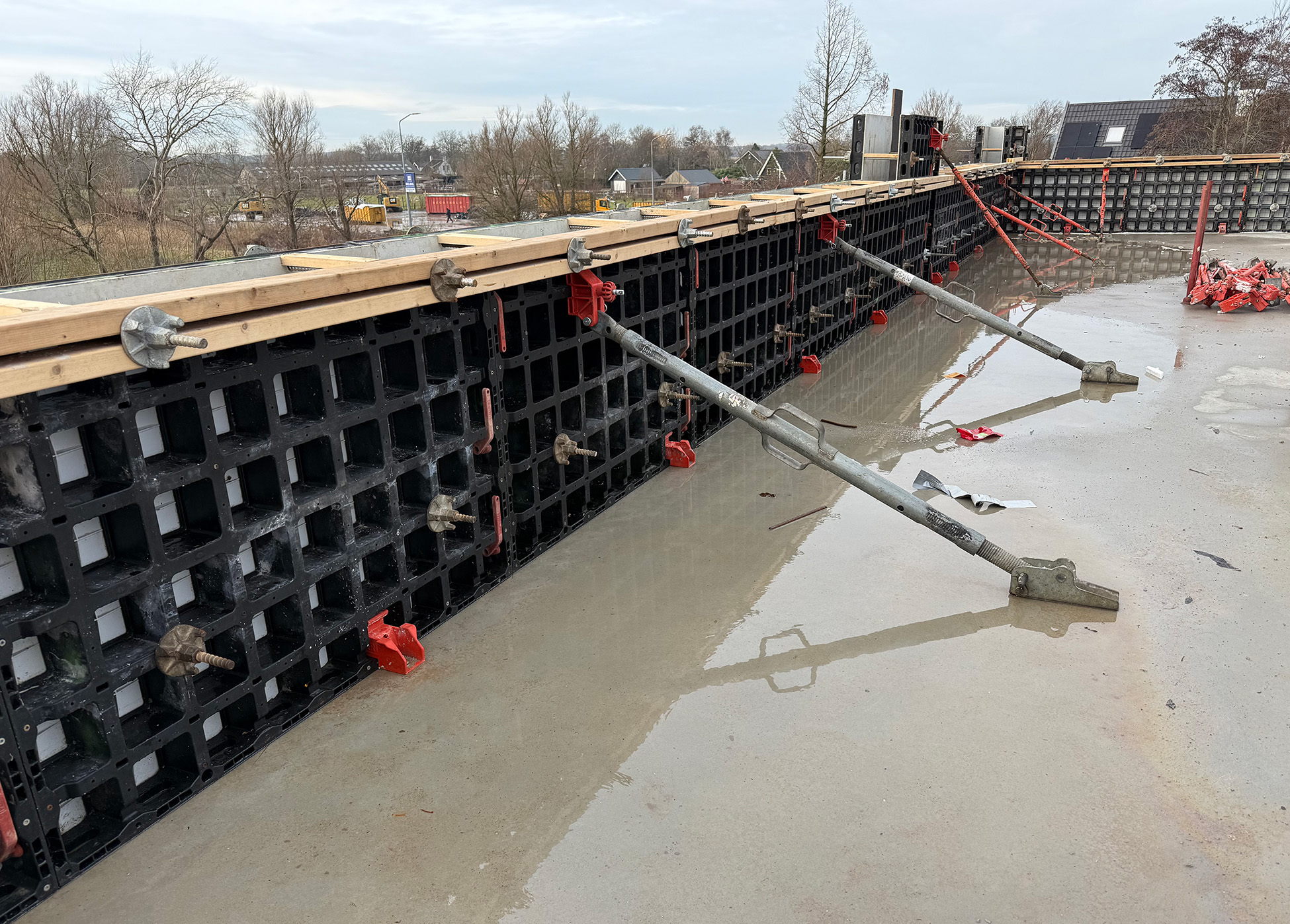 Dankzij de flexibiliteit van het DUO bekistingssysteem konden de panelen efficiënt worden ingezet, ook in deze specifieke situatie met relatief lage wanden. Dit zorgde voor een snelle en praktische, duurzame uitvoering op de bouwplaats zonder onnodige verspilling van hout.